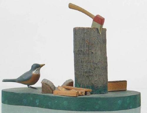 Delightful tiny miniature robin approx 1/3 in long on a green base with a chopping block and an axe carved of wood. A few pieces of firewood are glued on the base. Bottom reads, "Robin" and " Blaxton" along with the Gull ink stamp. Blaxton is the name for carvings that both Jess and Arthur Blackstone made. (decoy)