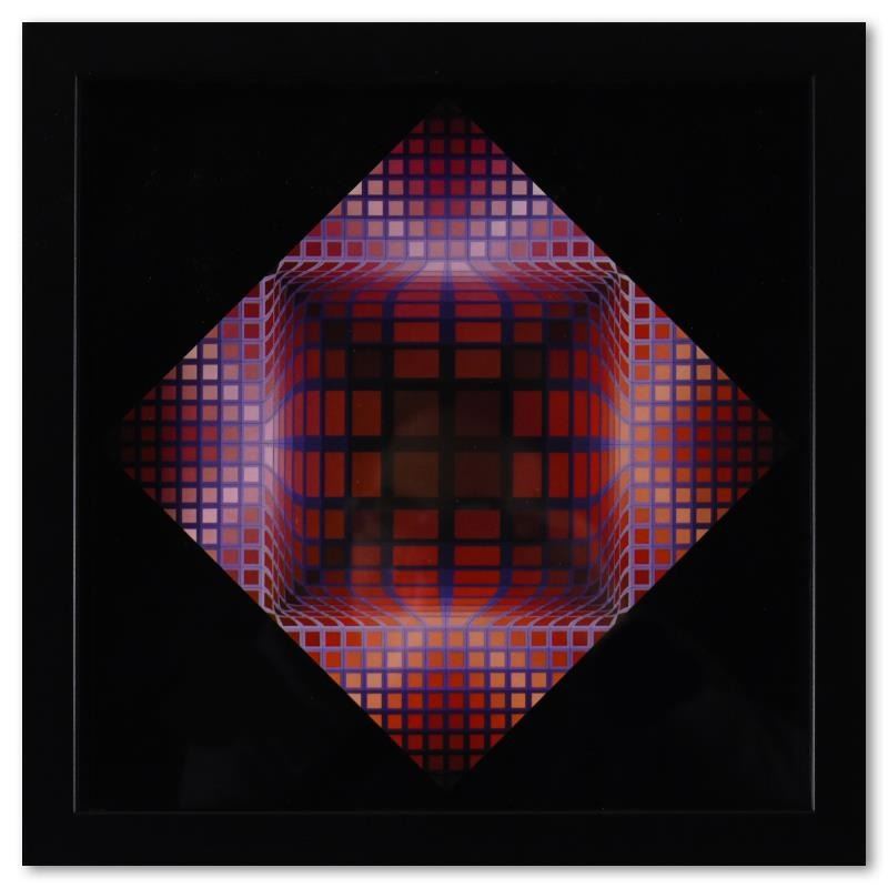 "Dell - 2 de la série Structures Universelles Du Damier" is a heliogravure print on paper, published in 1975, by Victor Vasarely (1908-1997). This piece comes custom framed, with a letter of authenticity and with a 1976 Vasarely paperback. Measures approx. 11.5" x 11.5" (frame), 9" x 9" (image).