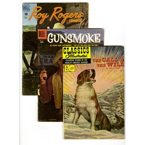 <B>Miscellaneous Golden Age Double Cover Group (Dell, 1949-55).</B></I> Each of these three comics has a double cover! The group lot includes <B>Four Color</B></I> #679 ("Gunsmoke" #1, photo cover; GD), <B>Roy Rogers</B></I> #24 (52 pages; FR/GD, bug chew), and <B>Classics Illustrated</B></I> #91 ("Call of the Wild," HRN 165; FN/VF). Approximate Overstreet value for group = $35.<BR><BR><b>Shipping:</b> Comics - Unslabbed (<a target="_blank" href="http://www.heritageauctions.com/common/shipping.php">view shipping information</a>)