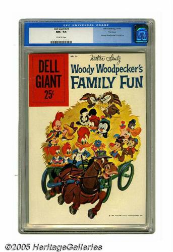 <B>Dell Giant #24 Woody Woodpecker's Family Fun File Copy (Dell, 1959) CGC NM+ 9.6 Off-white pages.</B></I> Woody and the entire Walter Lantz cast of characters star in this fun <B>Dell Giant</B></I>. It's a drop-dead gorgeous copy, with a snow-white background cover, razor-sharp edges and pin-point corners. Scouting out such a perfect square bound comic might take a lifetime -- except for all you lucky Heritage bidders, since we did the searching for you! Overstreet 2005 NM- 9.2 value = $155. CGC census 6/05: 5 in 9.6, none higher.