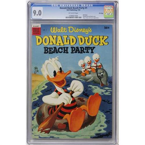 <B>Dell Giant Comics - Donald Duck Beach Party #1 File Copy (Dell, 1954) CGC VF/NM 9.0 Off-white pages.</B></I> Painted wraparound cover. Overstreet 2007 VF/NM 9.0 value = $215; NM- 9.2 value = $310. CGC census 3/08: 1 in 9.0, 1 higher.<BR><BR><b>Shipping:</b> Comics - Unslabbed (<a target="_blank" href="http://www.heritageauctions.com/common/shipping.php">view shipping information</a>)