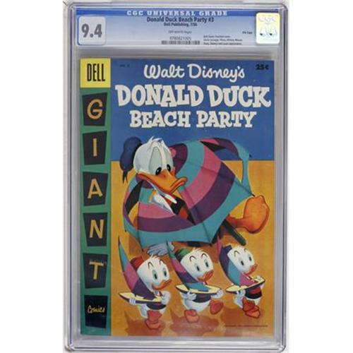 <B>Dell Giant Comics - Donald Duck Beach Party #3 File Copy (Dell, 1956) CGC NM 9.4 Off-white pages.</B></I> Painted cover. Uncle Scrooge, Pluto, and Mickey Mouse appear. Tony Strobl, Paul Murry, and Jack Bradbury art. Overstreet 2007 NM- 9.2 value = $210. CGC census 3/08: 2 in 9.4, none higher.<BR><BR><b>Shipping:</b> Comics - Unslabbed (<a target="_blank" href="http://www.heritageauctions.com/common/shipping.php">view shipping information</a>)