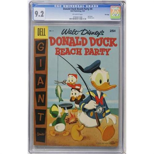 <B>Dell Giant Comics - Donald Duck Beach Party #4 File Copy (Dell, 1957) CGC NM- 9.2 Off-white pages.</B></I> Donald Duck, Mickey Mouse, Minnie Mouse, and Goofy appear. Tony Strobl, Al Hubbard, and Pete Alvardo art. Overstreet 2007 NM- 9.2 value = $210. CGC census 3/08: 1 in 9.2, 2 higher.<BR><BR><b>Shipping:</b> Comics - Unslabbed (<a target="_blank" href="http://www.heritageauctions.com/common/shipping.php">view shipping information</a>)