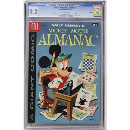 <B>Dell Giant Comics - Mickey Mouse Almanac #1 File Copy (Dell, 1957) CGC NM- 9.2 Off-white pages.</B></I> Painted cover. Carl Barks art. Overstreet 2007 NM- 9.2 value = $525. CGC census 3/08: 1 in 9.2, none higher.<BR><BR><b>Shipping:</b> Comics - Unslabbed (<a target="_blank" href="http://www.heritageauctions.com/common/shipping.php">view shipping information</a>)