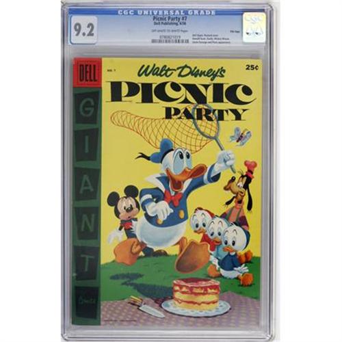 <B>Dell Giant Comics - Picnic Party #7 File Copy (Dell, 1956) CGC NM- 9.2 Off-white to white pages.</B></I> Painted cover. Donald Duck, Mickey Mouse, Uncle Scrooge, and Plato appearances. Overstreet 2007 NM- 9.2 value = $230. CGC census 3/08: 1 in 9.2, none higher.<BR><BR><b>Shipping:</b> Comics - Unslabbed (<a target="_blank" href="http://www.heritageauctions.com/common/shipping.php">view shipping information</a>)