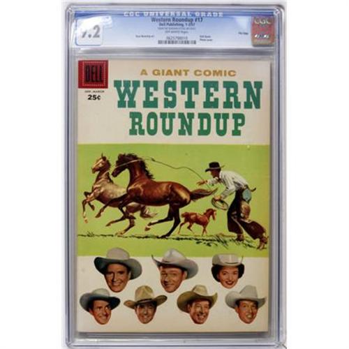 <B>Dell Giant Comics - Western Roundup #17 File Copy (Dell, 1957) CGC NM- 9.2 Off-white pages.</B></I> Photo cover. Russ Manning art. CGC notes, "From the Random House Archives." Overstreet 2007 NM- 9.2 value = $180. CGC census 9/07: 2 in 9.2, 3 higher.<BR><BR><b>Shipping:</b> Comics - Slabbed (certified) (<a target="_blank" href="http://www.heritageauctions.com/common/shipping.php">view shipping information</a>)