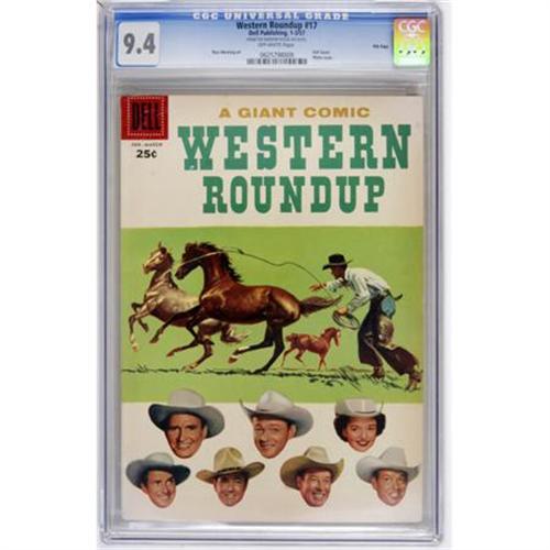 <B>Dell Giant Comics Western Roundup #17 File Copy (Dell, 1957) CGC NM 9.4 Off-white pages.</B></I> Photo cover. Russ Manning art. CGC notes, "From the Random House Archives." Overstreet 2007 NM- 9.2 value = $180. CGC census 10/07: 2 in 9.4, 1 higher.<BR><BR><b>Shipping:</b> Comics - Slabbed (certified) (<a target="_blank" href="http://www.heritageauctions.com/common/shipping.php">view shipping information</a>)