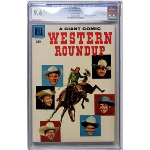 <B>Dell Giant Comics Western Roundup #18 File Copy (Dell, 1957) CGC NM+ 9.6 Off-white pages.</B></I> Alex Toth art. Gene Autry ends. Roy Rogers back cover photo. CGC notes, "From the Random House Archives." Overstreet 2007 NM- 9.2 value = $200. CGC census 10/07: 2 in 9.6, none higher.<BR><BR><b>Shipping:</b> Comics - Slabbed (certified) (<a target="_blank" href="http://www.heritageauctions.com/common/shipping.php">view shipping information</a>)
