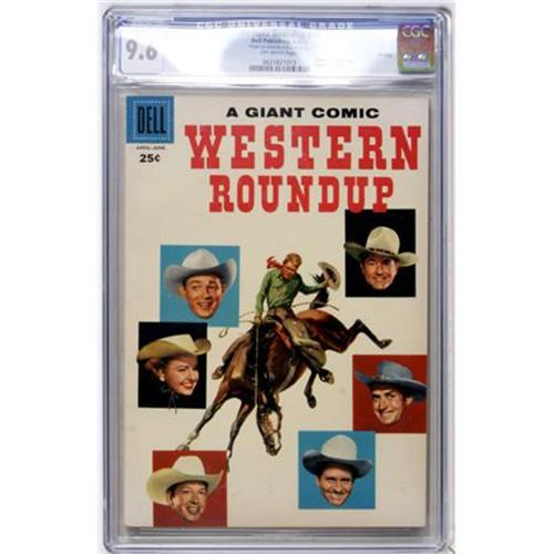 <B>Dell Giant Comics - Western Roundup #18 File Copy (Dell, 1957) CGC NM+ 9.6 Off-white pages.</B></I> Alex Toth art. Gene Autry ends. Roy Rogers back cover photo. CGC notes, "From the Random House Archives." Overstreet 2007 NM- 9.2 value = $200. CGC census 9/07: 2 in 9.6, none higher.<BR><BR><b>Shipping:</b> Comics - Slabbed (certified) (<a target="_blank" href="http://www.heritageauctions.com/common/shipping.php">view shipping information</a>)