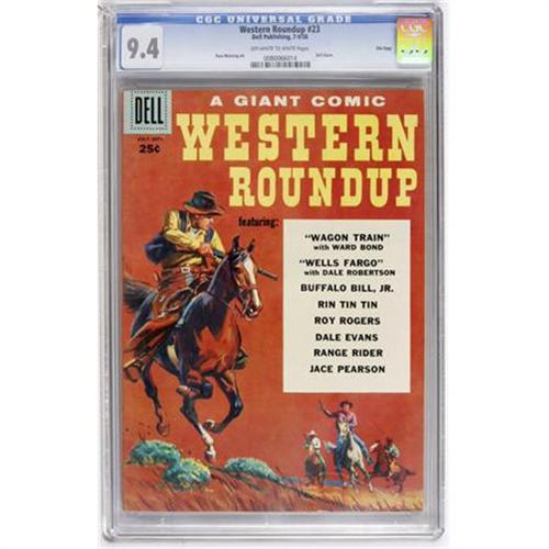 <B>Dell Giant Comics Western Roundup #23 File Copy (Dell, 1958) CGC NM 9.4 Off-white to white pages.</B></I> Russ Manning art. Overstreet 2007 NM- 9.2 value = $180. CGC census 10/07: 3 in 9.4, none higher.<BR><BR><b>Shipping:</b> Comics - Slabbed (certified) (<a target="_blank" href="http://www.heritageauctions.com/common/shipping.php">view shipping information</a>)