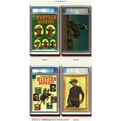Dell Giant Group Lot- Western Roundup File Copies (Dell). These 84-page Dell Giant comics feature a compilation of Dell's stable of western stars. Roy Rogers, Gene Autry, Rex Allen, Johnny Mack Brown and Bill Elliott are all featured on the photo covers and interior stories. These are ultra high-grade file copies, unread and undistributed, with great gloss and minimal wear. This lot includes: Western Roundup #2 CGC NM- 9.2 Cream to off-white pages; #17 NM 9.4 Off-white pages; #18 NM- 9.2 Off-white pages. Overstreet 2001 NM 9.4 value for group = $500. 3 Important notice: We expect to be auctioning lots at the rate of 200-250 per hour. Sometimes eBay Premier live bid software cannot keep up with that pace, so we strongly recommend that you place a realistic proxy bid now as insurance to avoid disappointment. Also please note that all Heritage/CAA lots purchased through eBay Premier carry a 20% Buyer's Premium.