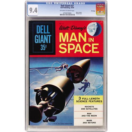 <B>Dell Giants #27 Man In Space - File Copy (Dell, 1959) CGC NM 9.4 Off-white to white pages.</B></I> Based on the Walt Disney TV show, this issue has a painted cover with square binding and 100 pages. Overstreet 2006 NM- 9.2 value = $175. CGC census 3/07: 1 in 9.4, none higher. <I> From the Cary and Cheryl Porter Collection.</B></I><BR><BR><b>Shipping:</b> Comics - Slabbed (certified) (<a target="_blank" href="http://www.heritageauctions.com/common/shipping.php">view shipping information</a>)