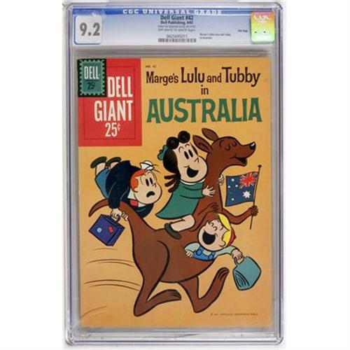 <B>Dell Giants #42 File Copy (Dell, 1961) CGC NM- 9.2 Off-white to white pages.</B></I> Featuring Marge's Little Lulu and Tubby in Australia. CGC notes, "From the Random House Archives." Overstreet 2007 NM- 9.2 value = $215. CGC census 10/07: 1 in 9.2, 6 higher.<BR><BR><b>Shipping:</b> Comics - Slabbed (certified) (<a target="_blank" href="http://www.heritageauctions.com/common/shipping.php">view shipping information</a>)