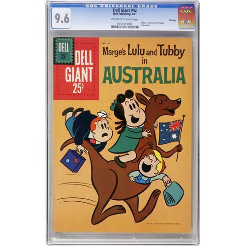 <B>Dell Giants #42 Marge's Little Lulu and Tubby in Australia - File Copy (Dell, 1961) CGC NM+ 9.6 Off-white to white pages.</B></I> Gorgeous copy of an issue that -- because it's square bound -- is usually found with spine wear. Not <I>this </B></I>file copy! Overstreet 2006 NM- 9.2 value = $215. CGC census 3/07: 3 in 9.6, none higher. <I> From the Cary and Cheryl Porter Collection.</B></I><BR><BR><b>Shipping:</b> Comics - Slabbed (certified) (<a target="_blank" href="http://www.heritageauctions.com/common/shipping.php">view shipping information</a>)