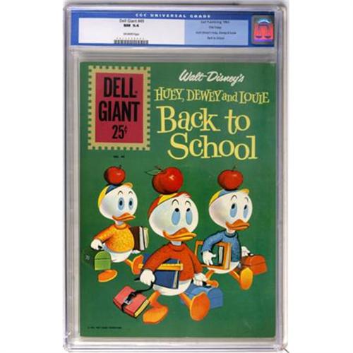 <B>Dell Giants #49 Huey, Dewey, and Louie Back to School - File Copy (Dell, 1961) CGC NM 9.4 Off-white pages.</B></I> Painted cover. Overstreet 2007 NM- 9.2 value = $170. CGC census 6/07: 3 in 9.4, 1 higher.<BR><BR><b>Shipping:</b> Comics - Slabbed (certified) (<a target="_blank" href="http://www.heritageauctions.com/common/shipping.php">view shipping information</a>)