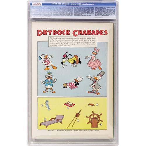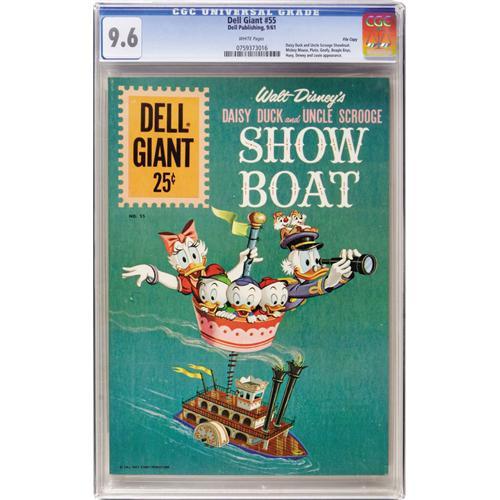 <B>Dell Giants #55 Daisy Duck and Uncle Scrooge Show Boat - File Copy (Dell, 1961) CGC NM+ 9.6 White pages.</B></I> Great page quality. Mickey Mouse, Pluto, Goofy, the Beagle Boys, and Huey, Dewey, and Louie appearances. Overstreet 2006 NM- 9.2 value = $165. CGC census 3/07: 2 in 9.6, none higher. <I> From the Cary and Cheryl Porter Collection.</B></I><BR><BR><b>Shipping:</b> Comics - Slabbed (certified) (<a target="_blank" href="http://www.heritageauctions.com/common/shipping.php">view shipping information</a>)