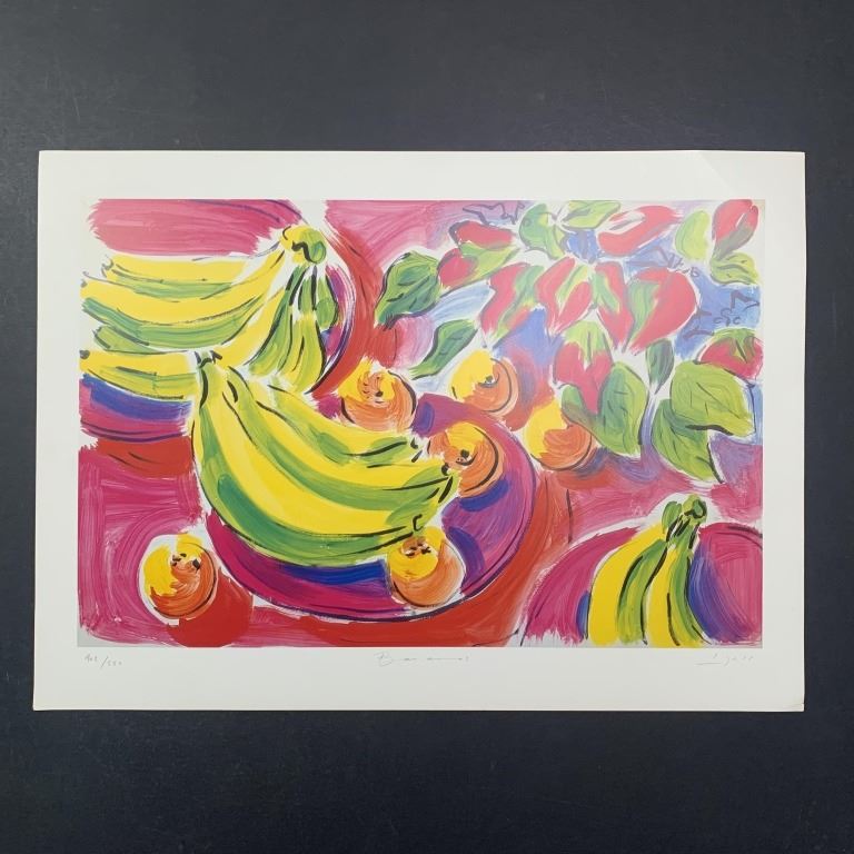 Dell's "Bananas" limted edition print, signed lower right, numbered 403/550 lower left, and titled lower middle. This piece is of some bananas and other fruint, done in a very colourful style. This piece is in near excellent condition with a minor crease upper right.