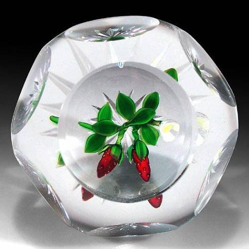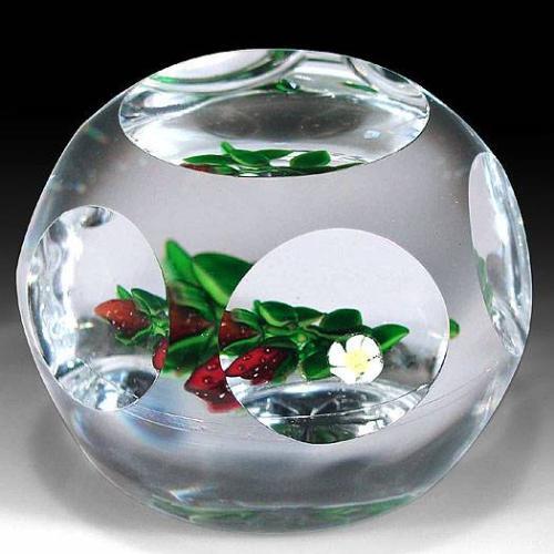 Delmo Tarsitano 1976 paperweight with two strawberries and single white flower, green leaves and stems. Six-and-one facets on clear star cut ground. Signature cane, dated. Diameter 2 11/16". Donated by: Debbie Tarsitano.<p>Proceeds from the auction will go to benefit Santa Cruz, California glass artist Steven Lundberg, who, after 30 years of blowing glass locally, was diagnosed with amyotrophic lateral sclerosis, or ALS (Lou Gehrig's disease). This auction is a fundraising effort to help Steve meet the challenges of this disease.<p>Costs of treating ALS over a period of time can be exorbitant. In the short-term, Steve needs basic equipment such as an electric scooter and pointing devices to help him read and write.<p>Please join us for this auction, and help support a friend. Check out our other auctions to see the 150 paperweights, vessels, and glass sculptures from internationally known glass artists, donated by generous artists, galleries, and glass collectors from all over the country. Please contact us at 1-800-538-0766 or (831) 427-1177 for more information, or see <a href=http://www.selman.com/press target=_blank>www.selman.com/press</a>.