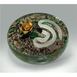 Delmo Tarsitano "earth-life" snake paperweight, with an unusual white latticinio snake, having a dark brown head, coiled near an upright yellow and orange desert flower, on pebbly earth ground. A great example of the elder Tarsitano's "earth-life" series of paperweights-realistic presentations of snakes and spiders in their natural environments. "My desert scenes have reptiles, cactus plants, everything. They keep evolving. I just keep going." -All About Paperweights. "DT" signature cane. Produced circa 1985. Diameter 3 3/8". $4500-5000