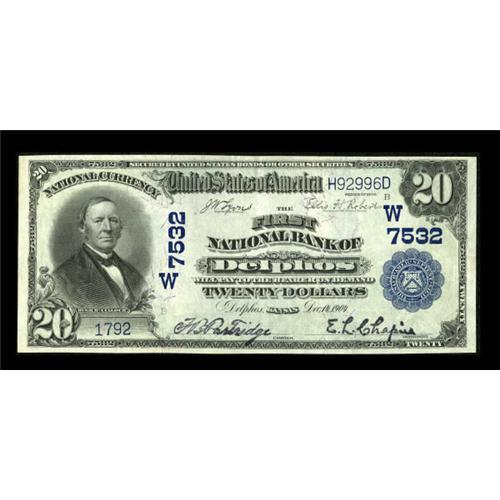 <B>Delphos, KS</B></I> - $20 1902 Plain Back Fr. 650 <B>The First NB</B></I> Ch. # (W)7532<BR> This $20 is well margined and features the stamped signatures of F.B. Partridge and E. L. Chapin. Pleasing <B>Extremely Fine.</B></I><BR><BR><b>Shipping:</b> Coins & Currency (<a target="_blank" href="http://www.heritageauctions.com/common/shipping.php">view shipping information</a>)