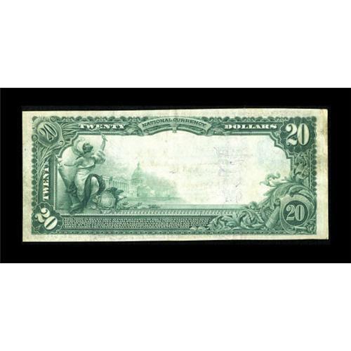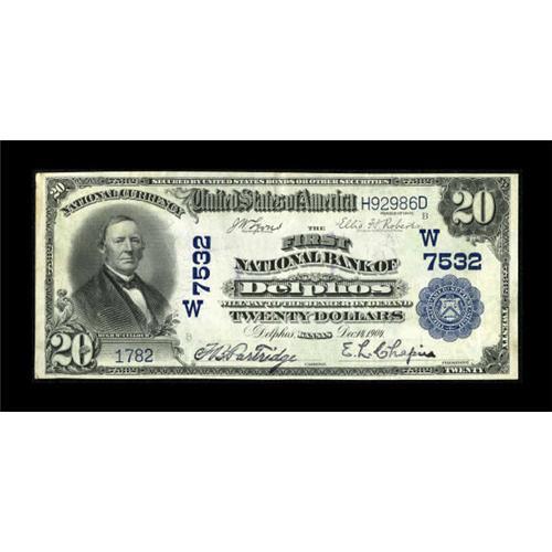 <B>Delphos, KS</B></I> - $20 1902 Plain Back Fr. 650 <B>The First NB</B></I> Ch. # 7532<BR> This $20 is well margined and features the stamped signatures of F.B. Partridge and E. L. Chapin. A small corner defect is noticed at lower left. <B>Very Fine+.</B></I><BR><I>From The J.S. Weber Collection.</B></I><BR><BR><b>Shipping:</b> Coins & Currency (<a target="_blank" href="http://www.heritageauctions.com/common/shipping.php">view shipping information</a>)