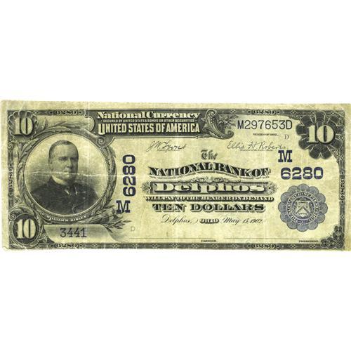 <B>Delphos, OH</B></I> - $10 1902 Plain Back Fr. 624 <B>The NB of Delphos</B></I> Ch. # (M)6280<BR>The Kelly census lists just three notes from this rare Delphos bank, which liquidated at the expiration of its charter in 1922. This piece is new to that listing. <B>Fine,</B></I> the signatures faded.