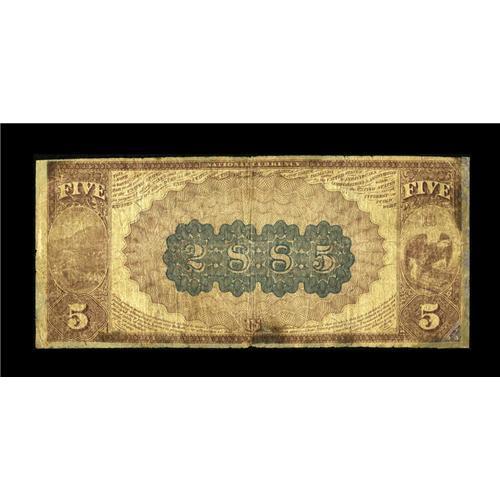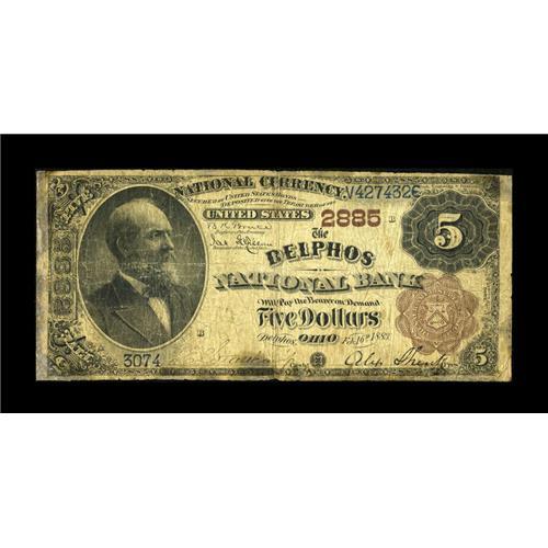 <B>Delphos, OH</B></I> - $5 1882 Brown Back Fr. 466 <B>The Delphos NB</B></I> Ch. # 2885<BR>An excessively rare bank which issued Five, Fifty and Hundred dollar Brown Backs only before liquidating in 1902. While two other examples are known to exist, our records disclose that neither has been offered to collectors at public sale since our data span began in 1944. There is some very minor damage along with a few stains, but where can another example from this bank be obtained at any price? <B>Very Good.</B></I><BR><BR><b>Shipping:</b> Coins & Currency (<a target="_blank" href="http://www.heritageauctions.com/common/shipping.php">view shipping information</a>)