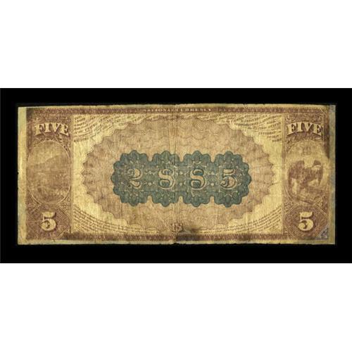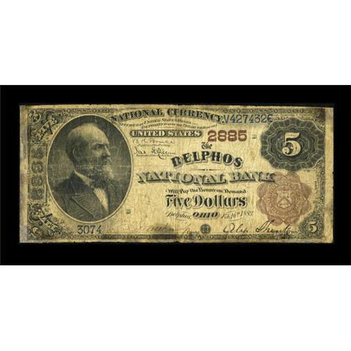 <B>Delphos, OH</B></I> - $5 1882 Brown Back Fr. 466 <B>The Delphos NB</B></I> Ch. # 2885<BR> An excessively rare bank which issued Five, Fifty and Hundred dollar Brown Backs only before liquidating in 1902. While two other examples are known to exist, our records disclose that neither has been offered to collectors at public sale since our data span began in 1944. There is some very minor damage along with a few stains, but where can another example from this bank be obtained at any price? <B>Very Good.</B></I><BR><BR><b>Shipping:</b> Coins & Currency (<a target="_blank" href="http://www.heritageauctions.com/common/shipping.php">view shipping information</a>)