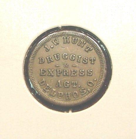 J.W. Hunt Druggist & Express Agent" Delphos Ohio.250A-2a R3 Civil War Token. Brown AU.
