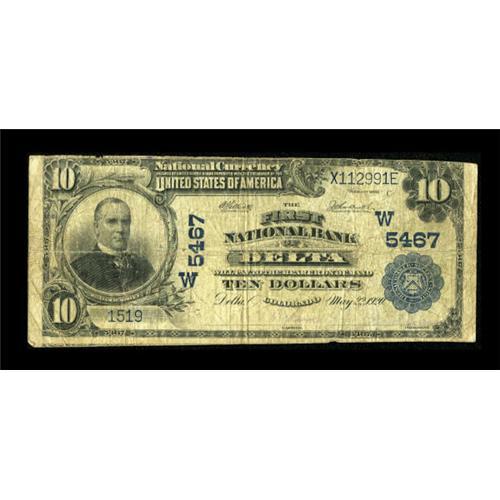 <B>Delta, CO</B></I> - $10 1902 Plain Back Fr. 633 <B>The First NB</B></I> Ch. # (W)5467<BR> Few of the notes that survived from this bank escaped heavy use in circulation. This piece is evenly worn and solid for the grade with only a couple of pinholes at intersecting folds. <B>Very Good.</B></I><BR><BR><b>Shipping:</b> Coins & Currency (<a target="_blank" href="http://www.heritageauctions.com/common/shipping.php">view shipping information</a>)