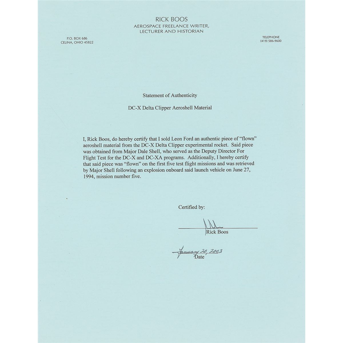 Two small fragments of flown material recovered from the aeroshell of the McDonnell Douglas DC-X Delta Clipper affixed to a commemorative cover with a cachet honoring the experimental vehicle. In fine condition. Accompanied by certificates of authenticity stating that this material was flown on the first five test flight missions and retrieved by Major Dale Shell from pieces damaged in a minor inflight explosion during the fifth launch. Also accompanied by two photos of the craft during launch.