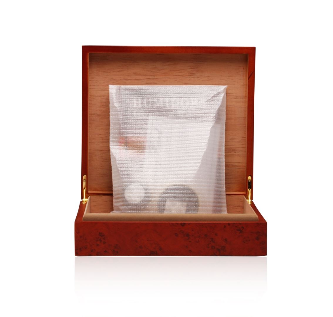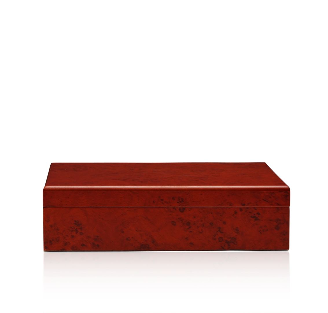 One El deluxe cigar humidor featuring a glossy burl wood exterior lined with premium Spanish cedar and solid brass hardware. Beautifully handcrafted to provide your cigars with the perfect environment for storage. This deluxe humidor will surely enhance your cigars smell and taste. Includes: Humidor, Hygrometer, Humidification System, Accessories, Instructions Manual. Measures 10 x 2.5 x 9.75 inches.