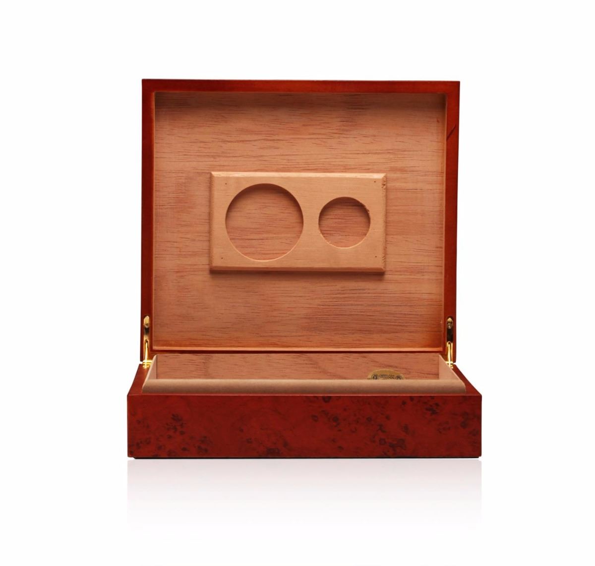 One El deluxe cigar humidor featuring a glossy burl wood exterior lined with premium Spanish cedar and solid brass hardware. Beautifully handcrafted to provide your cigars with the perfect environment for storage. This deluxe humidor will surely enhance your cigars smell and taste. Includes: Humidor, Hygrometer, Humidification System, Accessories, Instructions Manual. Measures 10 x 2.5 x 9.75 inches.