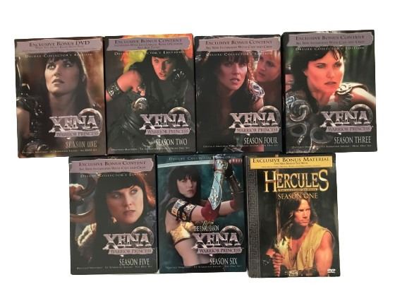 Deluxe Collector's Edition Disc sets of Xena: Warrior Princess Seasons 1-6 and Season one of Hercules The Legendary Journeys. Each box: 8"x 6". 7 boxes in total. All items come direct from the collection of the western chairman of Xena Warrior Princess' official fan club.