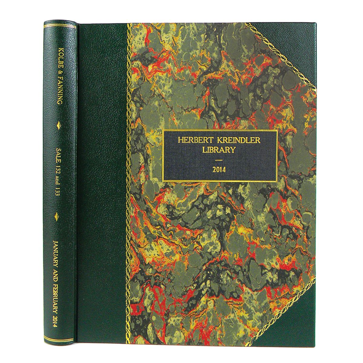 Kolbe & Fanning Numismatic Booksellers. THE 2014 NEW YORK BOOK AUCTION: THE HERBERT KREINDLER LIBRARY. New York, Jan. 11, 2014. 120 pages; 600 lots numbered 1001-1600; illustrated in color. [bound with] Kolbe & Fanning Numismatic Booksellers, with Fritz Rudolf Künker GmbH & Co. THE HERBERT KREINDLER LIBRARY, PART II. Gahanna and Osnabrück, Feb. 13, 2014. 92 pages; 800 lots numbered 4001-4800. Two catalogues bound in one volume. 4to, recent green half morocco, gilt, with marbled sides; gilt-printed lettering piece on front cover. Prices realized lists for both sales bound in. New. One of only five copies of the deluxe leatherbound combined edition of the Kreindler library sales, and the only one to be offered for public sale. The Kriendler library was notable for its comprehensive scope in the field of ancient numismatics.