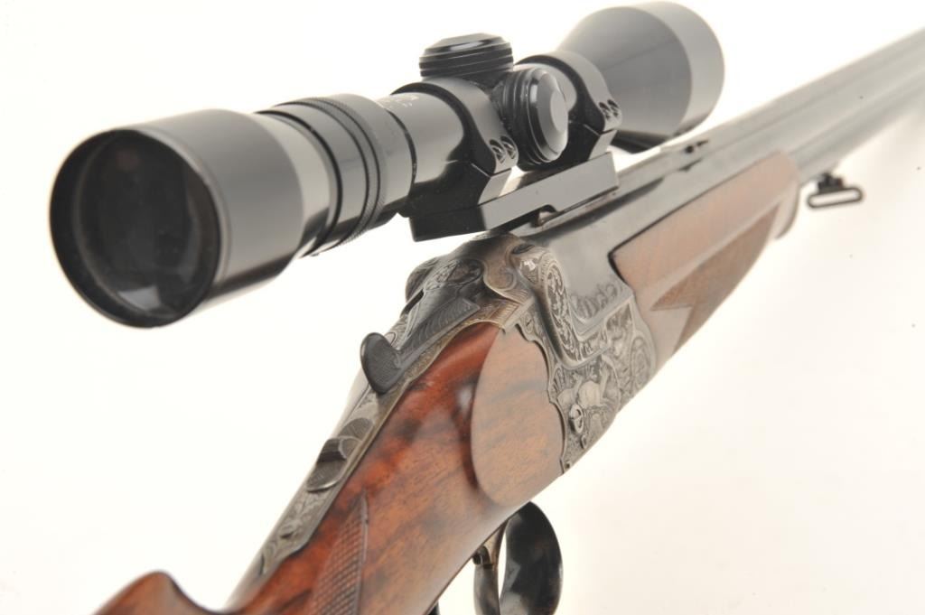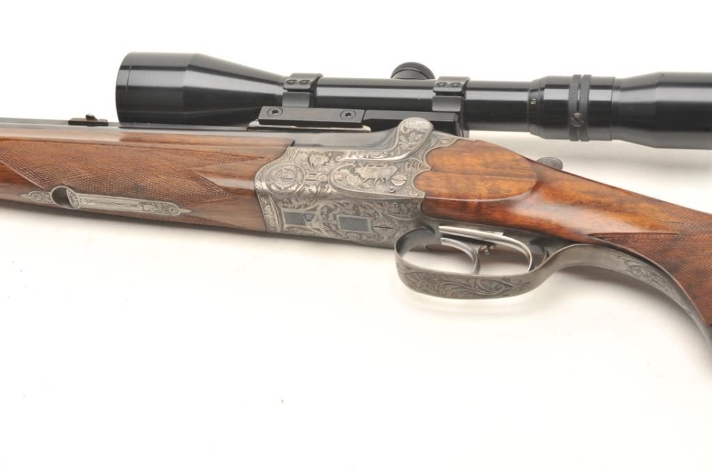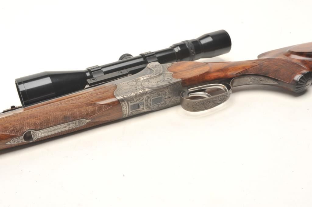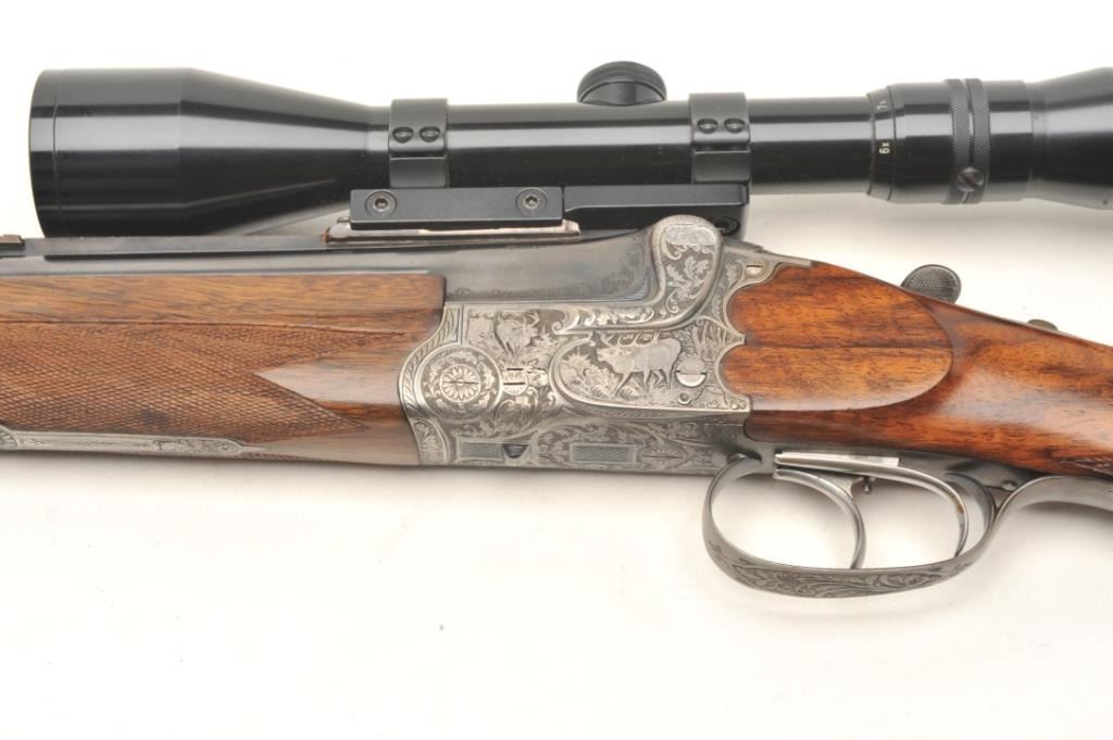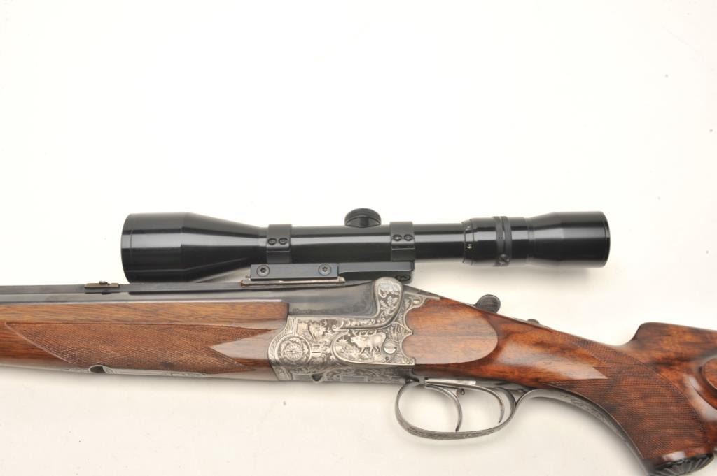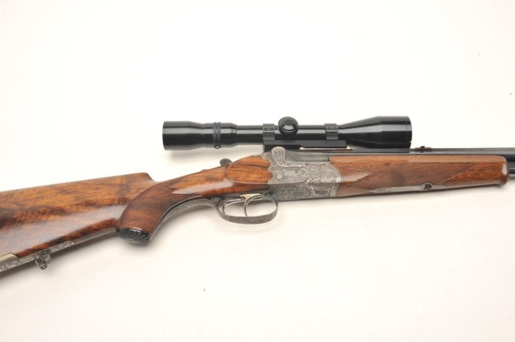 Deluxe German Combination Gun by Emil Pachmayr, 16 gauge over 7x57IR caliber, 27” barrels, blued finish, deluxe engraved receiver, trigger guard and bullet trap, deluxe checkered and grained wood stocks, S/N 14821, in overall fine condition with 3 highly detailed engraved game scenes (2 on the receiver, 1 on the bottom of the trigger guard), double triggers, sling swivels, fine bores, fine wood and finely carved horn buttplate. This beautiful combination gun is also mounted with a KKAHLES/WIEN adjustable scope with crisp optics. (C&R). Est.: $3,500-$7,000.