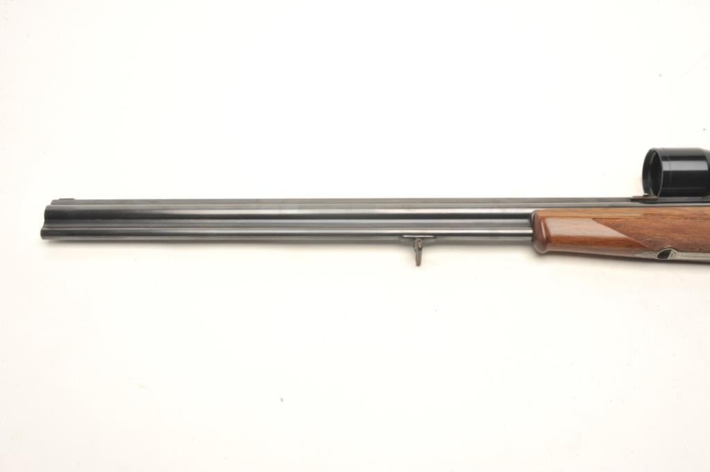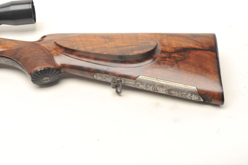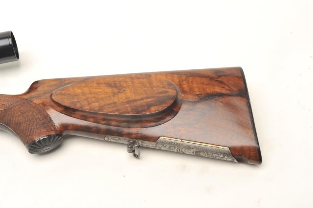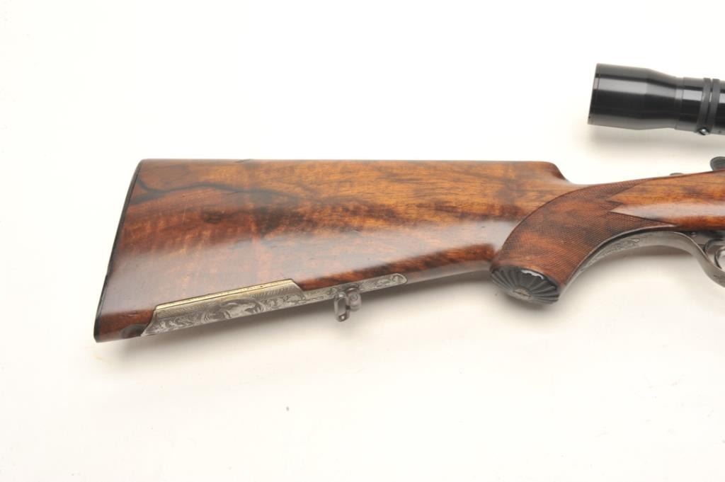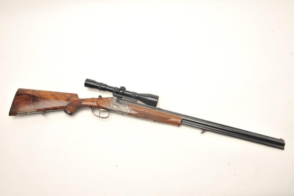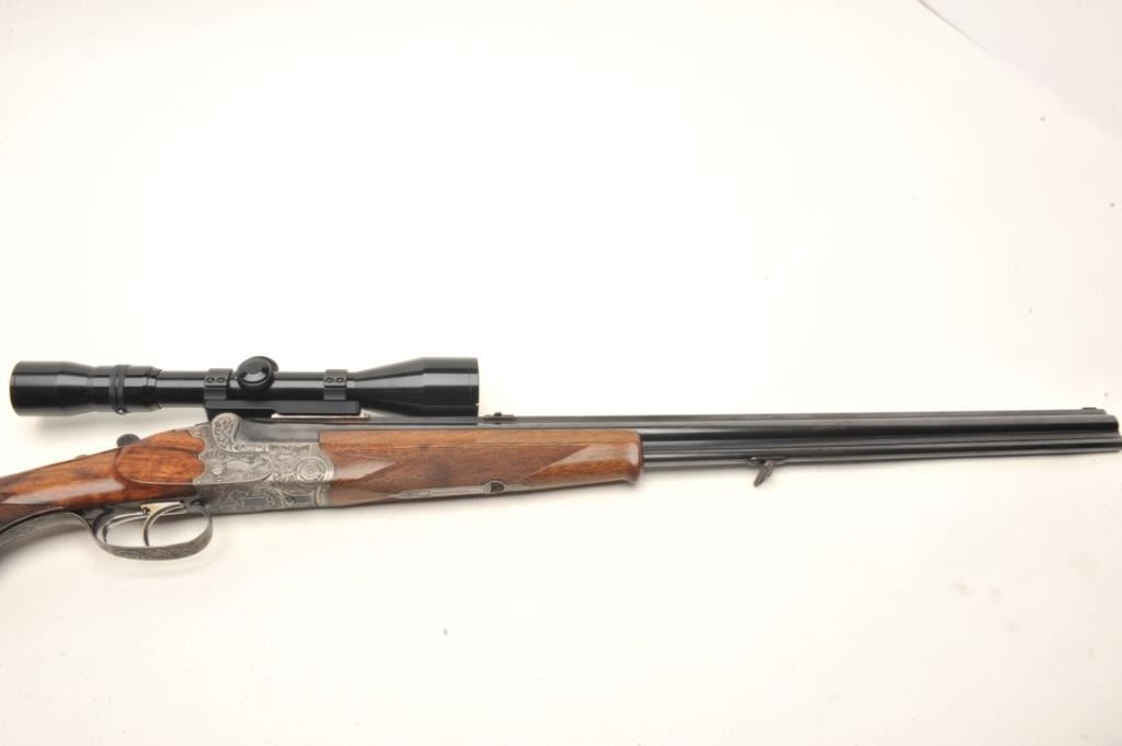 Deluxe German Combination Gun by Emil Pachmayr, 16 gauge over 7x57IR caliber, 27” barrels, blued finish, deluxe engraved receiver, trigger guard and bullet trap, deluxe checkered and grained wood stocks, S/N 14821, in overall fine condition with 3 highly detailed engraved game scenes (2 on the receiver, 1 on the bottom of the trigger guard), double triggers, sling swivels, fine bores, fine wood and finely carved horn buttplate. This beautiful combination gun is also mounted with a KKAHLES/WIEN adjustable scope with crisp optics. (C&R). Est.: $3,500-$7,000.