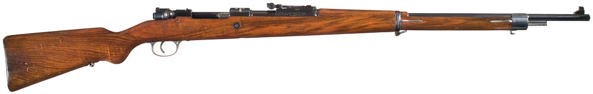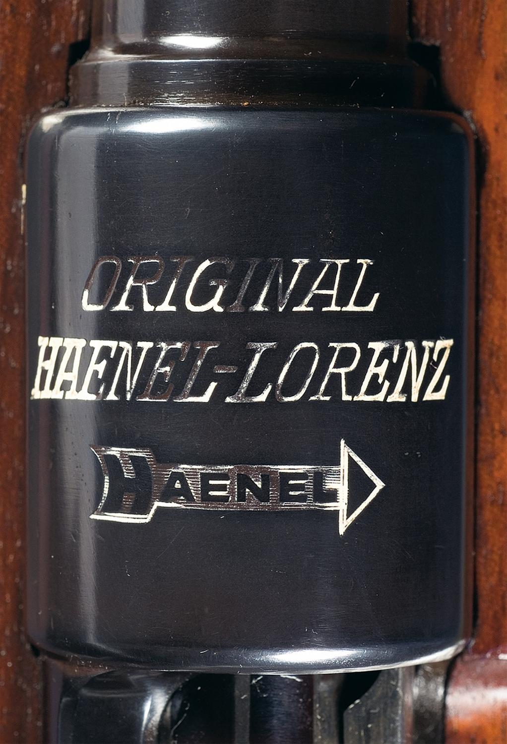 The top of the receiver ring is marked "ORIGINAL / HAENEL- LORENZ" over the Haenel arrow logo and the left side is marked with an "eagle/N" proof. Fixed ramp inverted "v" front sight and tangent rear sight graduated 100, 200 and 300 on the blade and graduated from 4 to 20 (even numbers) on each side of the barrel below the rear sight. Straight bolt handle, bayonet lug and mounted with a full walnut pistol grip stock with matching handguard, flat steel buttplate, sling swivel base on the buttstock and sling swivel on the rear barrel band.