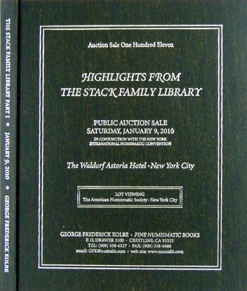 Kolbe, George Frederick. HIGHLIGHTS FROM THE STACK FAMILY LIBRARY. New York, Jan. 9, 2010. 172 pages; 400 lots; illustrated in color. [bound with, as issued] Kolbe, George Frederick. IMPORTANT NUMISMATIC LITERATURE: DUPLICATES FROM THE AMERICAN NUMISMATIC SOCIETY LIBRARY. New York, Jan. 9, 2010. 28 pages; 401-500 lots. 4to, original green Japanese cloth, impressed in silver; original printed card covers bound in; prices realized lists bound in. Fine. [with] Kolbe & Fanning Numismatic Booksellers. AUCTIONS ALE ONE HUNDRED SIXTEEN. PART TWO: THE STACK FAMILY LIBRARY. Gahanna, June 3, 2010. 4to, original green Japanese cloth, gilt; original printed card covers bound in. 112 pages; 1072 lots. Prices realized list bound in. Fine. The deluxe hardbound editions of Sales 111 and 116, both parts of the Stack Family numismatic library. Issued in limited numbers. The Stack library was one of the finest numismatic libraries formed in this country--almost certainly the finest formed by a commercial firm. It was only the second numismatic library to bring over $1 million in a single-day auction. Ex Raymond Hale library.