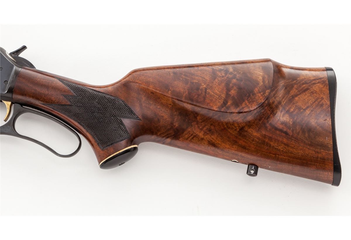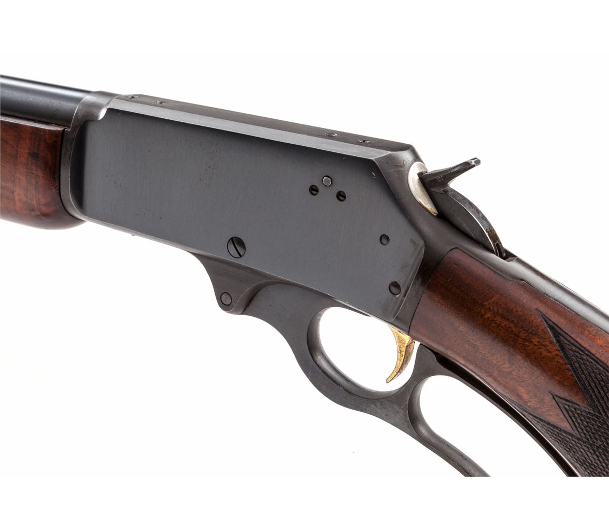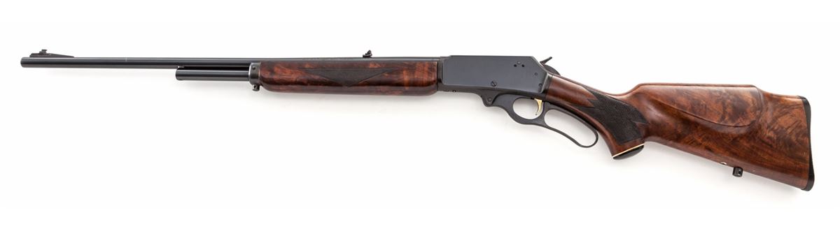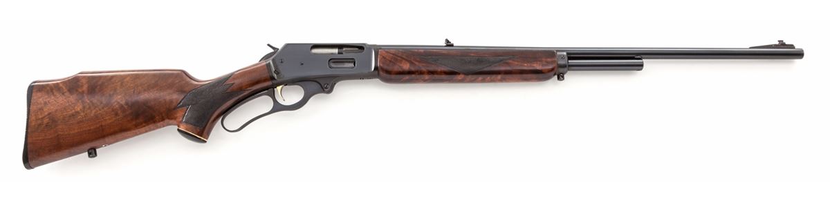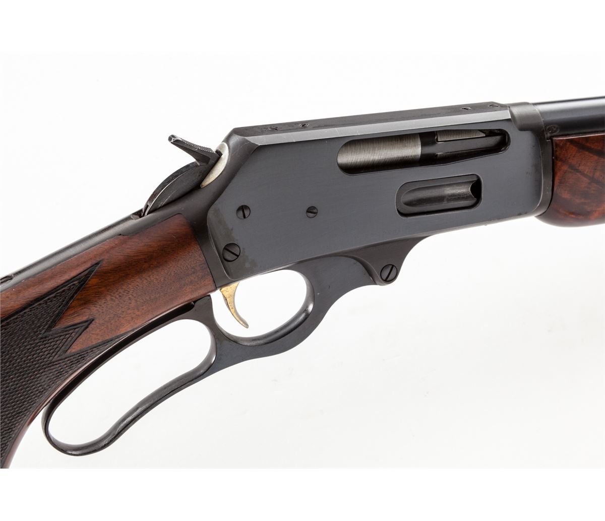 Deluxe Marlin Model 336 Lever Action Rifle, #T6777, .30-30 cal., 24'' barrel, blue finish, fancy checkered walnut cheekpiece stock. Condition is excellent retaining approx. 97% original factory blue with only light thinning at high edges. Stock shows light handling marks. Inter tip of forend shows thin glass bedding. Action is crisp, bore is bright. Est.: $800-$1,200. (C&R)