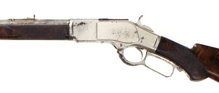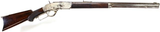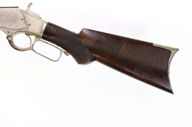 lever action rifle 24" octagon barrel, full mag, features deluxe oil stained wood, checkered pistol grip with full nickel finish, all features confirmed by factory letter, also listing graduated tang peep and Globe front sights now removed from gun. Overall very good condition and completely original, remaining nickel finish as follows: Barrel, mag tube 60-65%, chips or sharp barrel address, sporting rear sight 20-25%, forend 70%, receiver 75-80%, lever 60-65%, hammer and crescent butt plate 80-85%. Checkered forend shows fine condition unsanded, no chips, cracks or repairs, good wood to metal fit, rear pistol grip stock with very light nearly undetectable glue/repaired hairline on left side extending from tang bolt to checkering otherwise fine with some light marks and use dings. Nicely optioned deluxe 1873 in original untamped condition with good action and bore. Antique. Est. 6000-10000