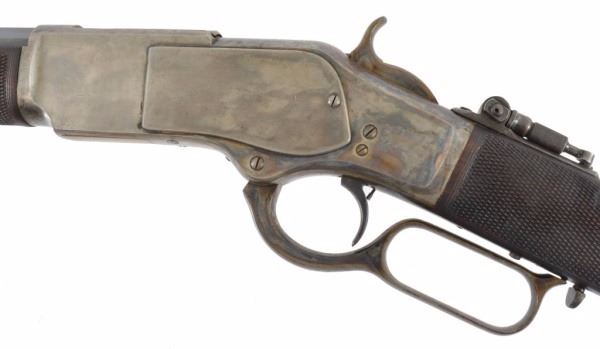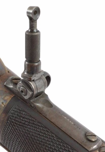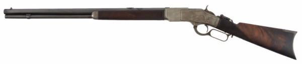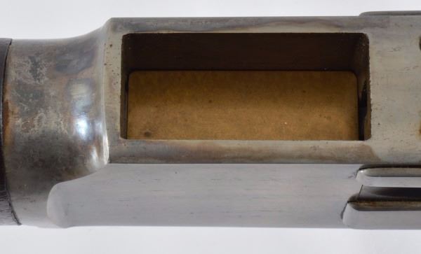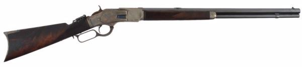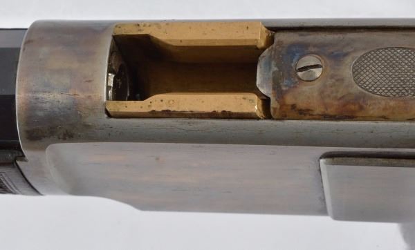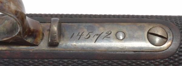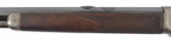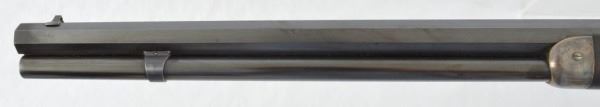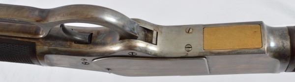 Serial no. 14572 excellent condition retaining 90%+ of blue & . 70%+ of the case hardening on the frame, lever, & hammer, & foregrip cap,.44 20" barrel octagon barrel with sharp address & good bore, set trigger, deluxe XXX checkered walnut in excellent condition. factory short peep & beach sights. with factory letter.