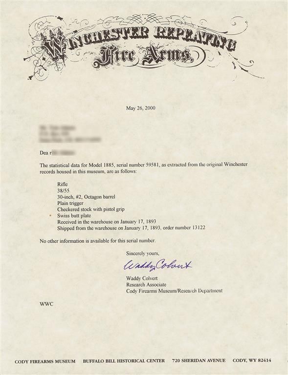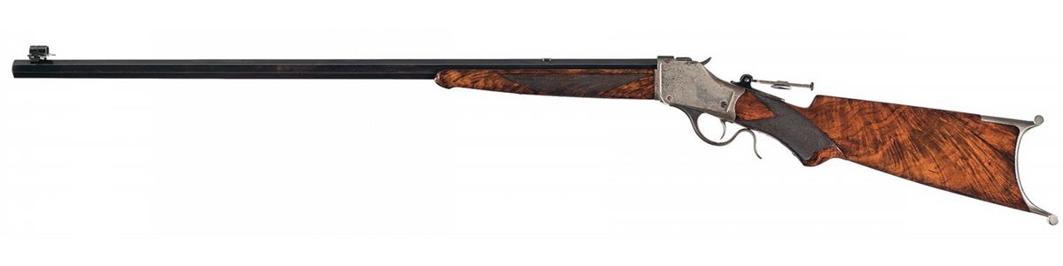 Manufactured in 1893, this High Wall rifle features a 30 inch #2 octagon barrel with a windage adjustable globe front sight, filler block in the rear sight dovetail slot and a mid-range Vernier tang mounted peep sight. The top barrel flat is marked with the standard two line address ahead of the rear sight slot and "38-55" at the breech. The bottom of the barrel in front of the forearm is marked "2" and the lower tang is marked with the patent date behind the trigger and the serial number behind the lever. The barrel is blue and the receiver and lever casehardened. Mounted with deluxe nicely figured checkered walnut Schnabel forearm with an ebony forend insert and round knob pistol grip stock with nickel plated Swiss buttplate. The accompanying factory letter verifies the rifle configuration, caliber, 30 inch octagon #2 barrel, plain trigger, checkered pistol grip stock with Swiss buttplate and that it was received and shipped out of the warehouse on order number 13122, January 17, 1893.