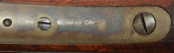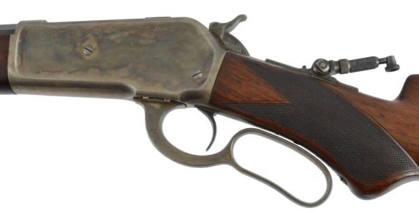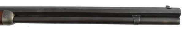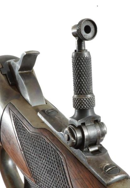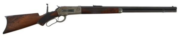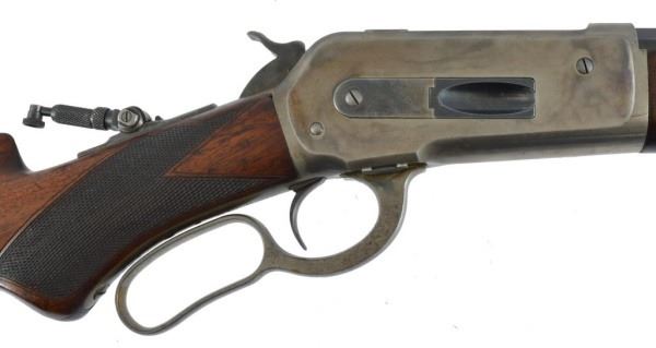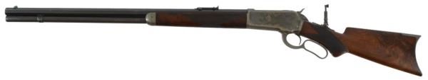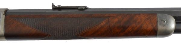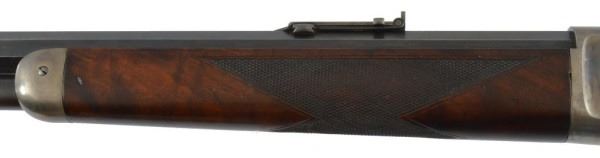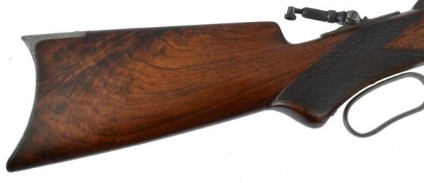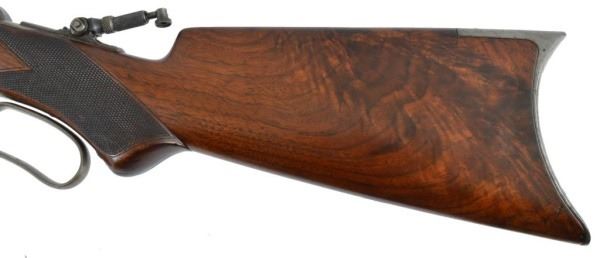 Serial no. 19436 .45-70 in very good condition with 80-90% of original finish on 26" octagon barrel with clear barrel address. strong case coloring on the left side of the frame carrying over to the right side loading gate fading away to nothing as it goes down. flip up peep sight. strong action. deluxe checkered wood in very good+ condition