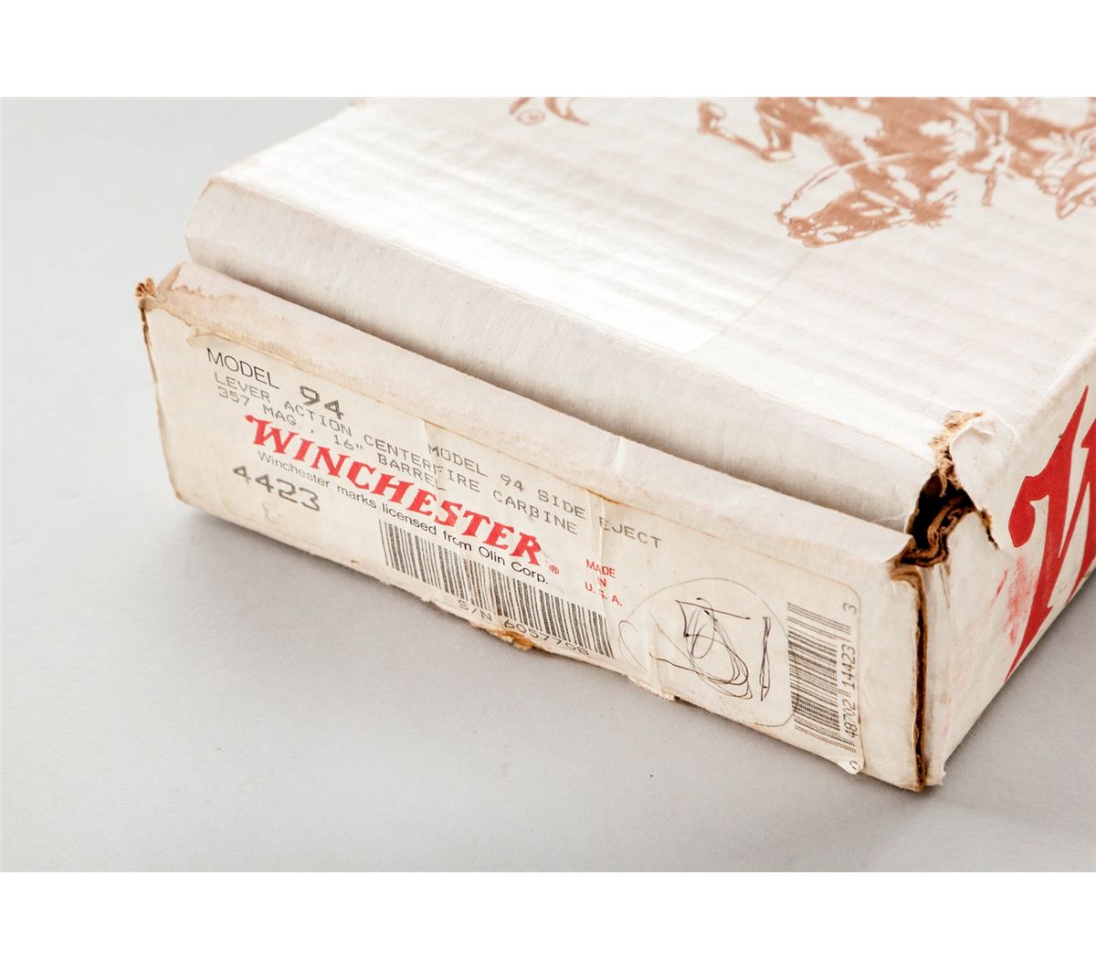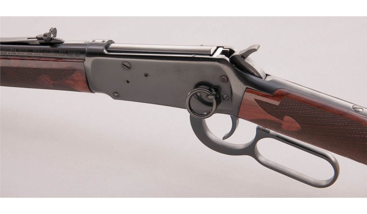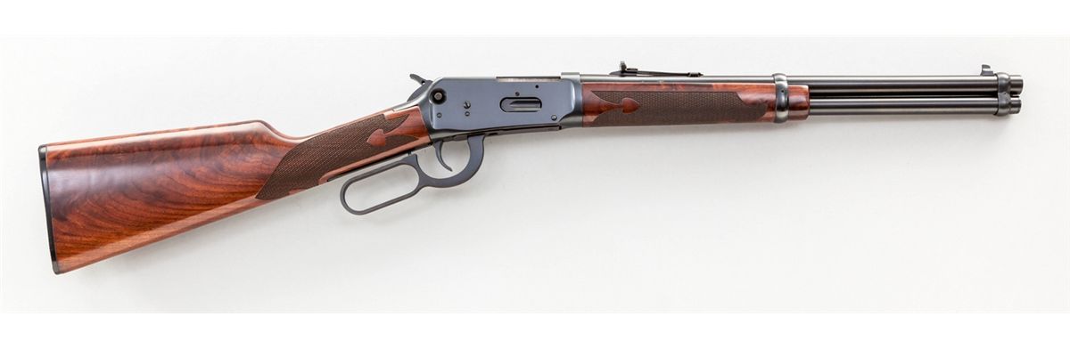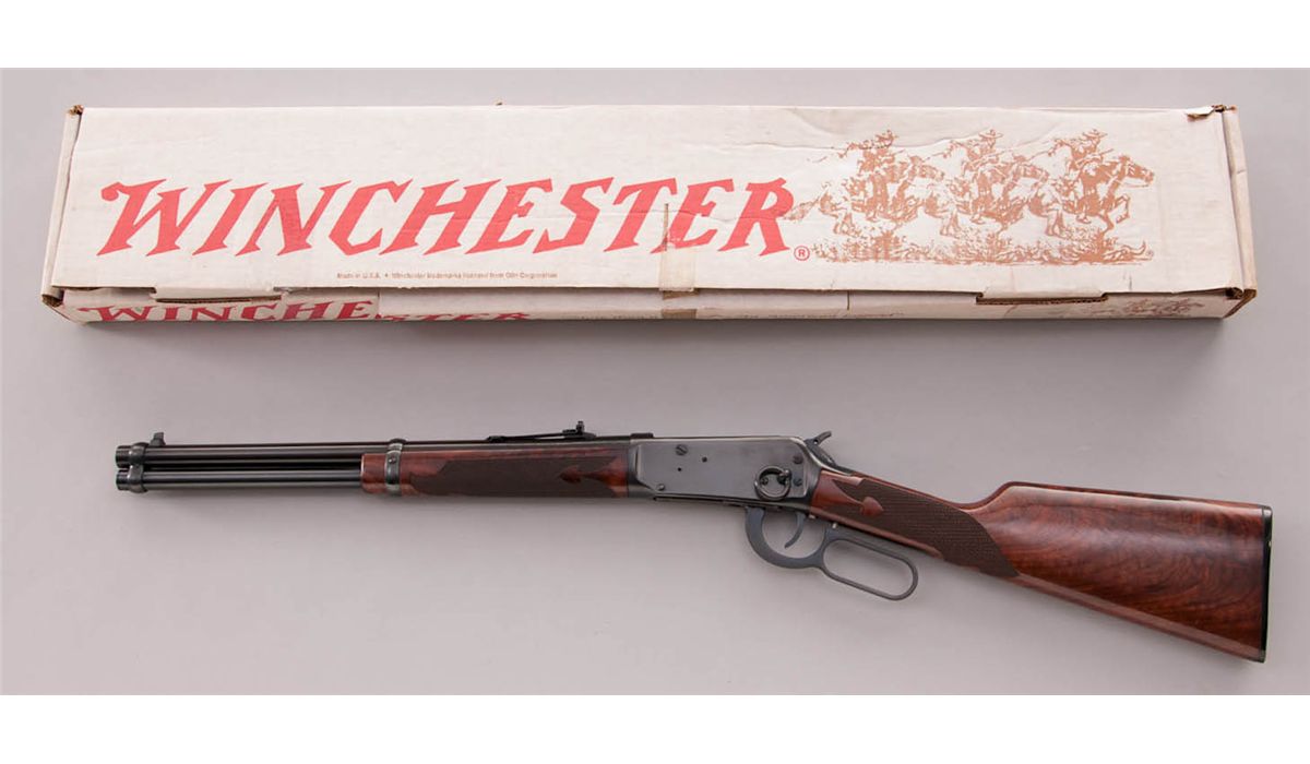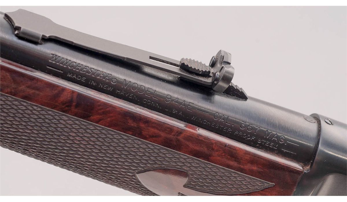 Deluxe Winchester Model 94AE Lever Action Trapper, #6057708, .357 mag. cal., 16'' barrel, blue finish, saddlering, hand-honed and polished action, factory dovetail front sight, buckhorn rear sight, spade checkered semi-fancy satin finish walnut stock, with black plastic Winchester buttplate. One of three built as a project between the Model Shop and Engineering. Letter states ''The main objective was to try and discover whether or not the gun in 357 Mag calibers could be continued or dropped from the line.'' In original factory red/white American Legend box, with correct end label, Custom Shop letter and receipt. Condition is excellent, as new and unfired, in original box.. Est.: $1,200-$1,500. (Modern)