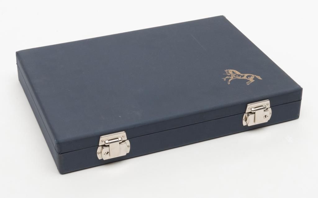 Deluxe case by Colt Custom Workshop for two Model 1911-A1s semi-auto pistols lined in suede with carved deluxe accessories set with Colt logos and Rampant Colt on fabric covered exterior. Note: select hardwood used as an air seal. A super boxthat would accent a magnificent pair. Est.: $500-$1,000