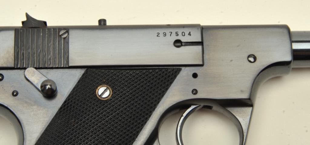 pistol, .22LR caliber, 4.5” barrel, S/N 297504, checkered hard rubber grips, in overall excellent condition. The interior of the presentation casing is two toned with informational plaques and a box of Winchester .22LR ammunition. (C&R/PPT). Est.: $600-$1,200.