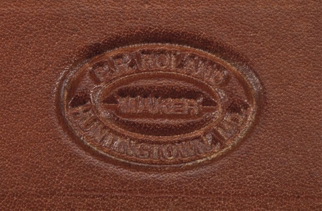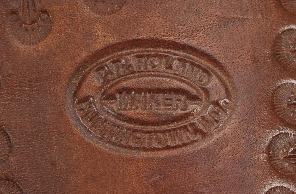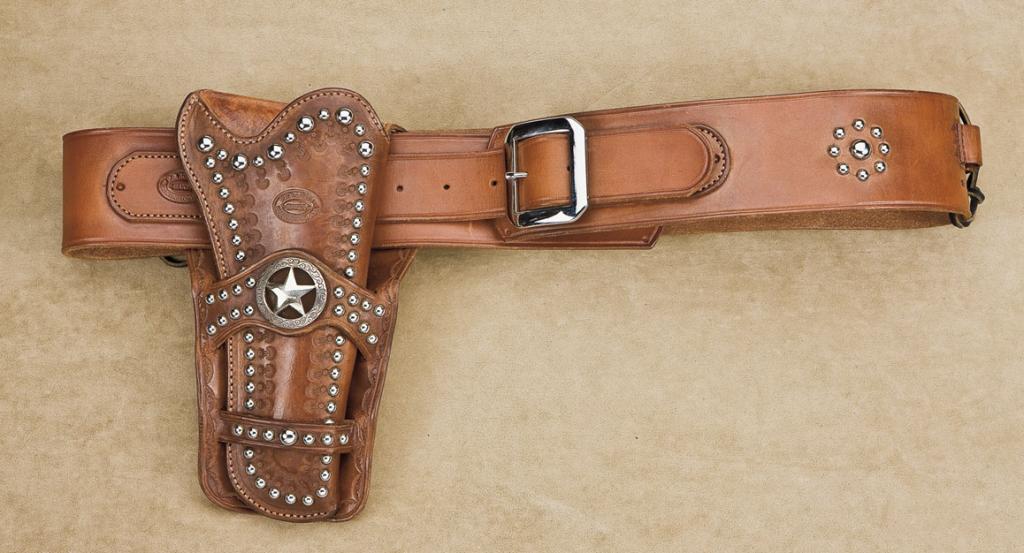 Deluxe custom tooled heavy leather double loop holster and cartridge belt by P.R. Roland of Huntingtown, Maryland for a 4-3/4" Colt SAA revolver in near new condition with maker marks on both the holster and belt, extensive nickel decorative tacking and a cut out five pointed sheriff's badge type ornament on the top loop of the holster. Est.: $350-700