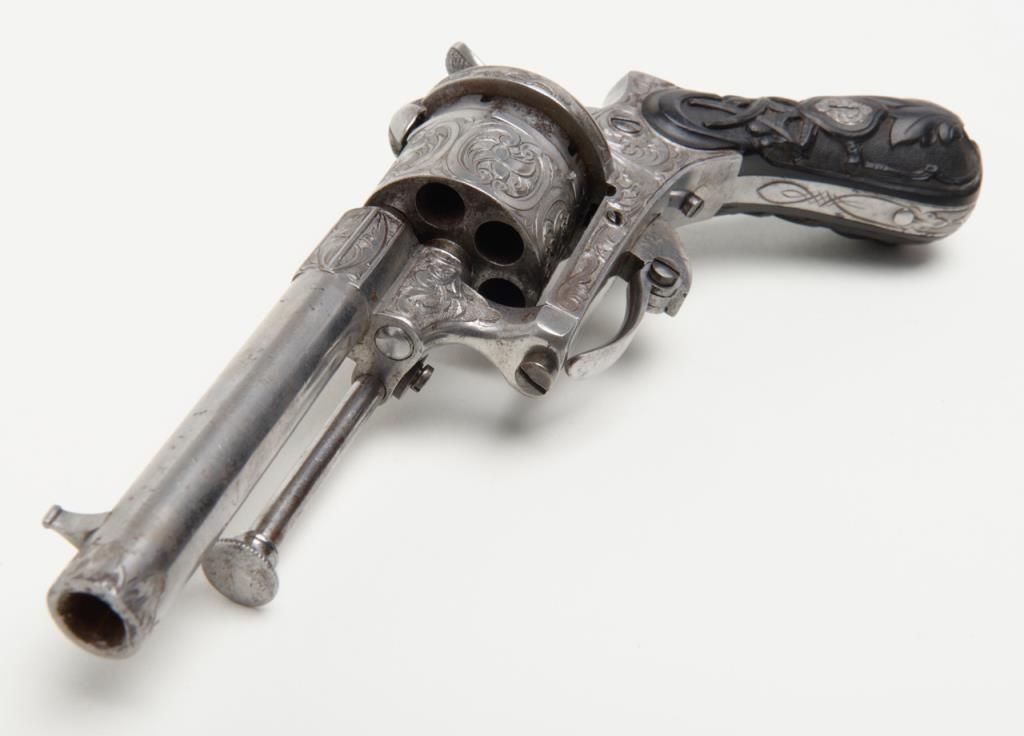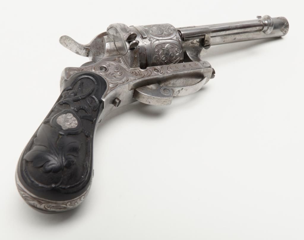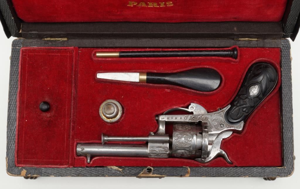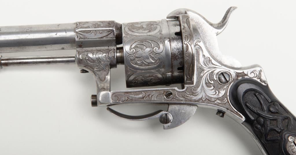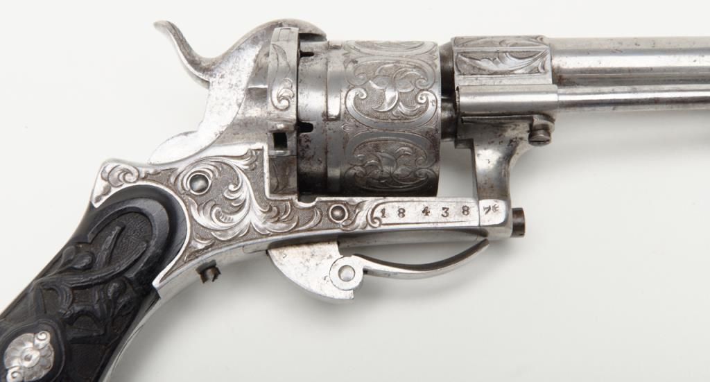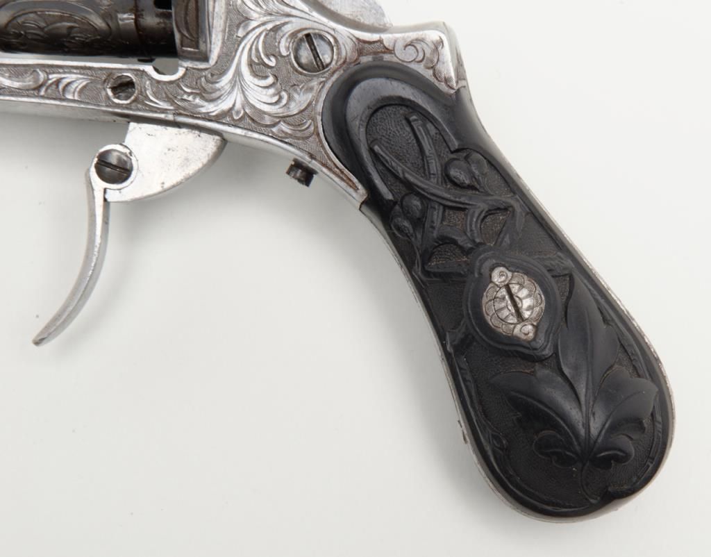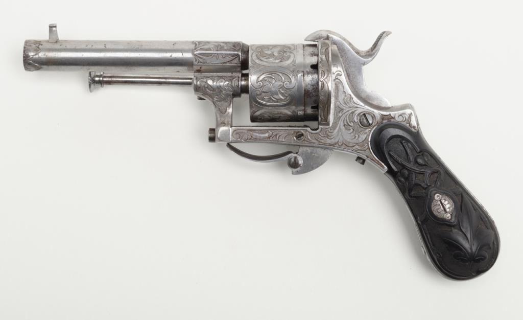 Deluxe engraved and cased double action pinfire revolver signed “Lefaucheux Inventeur, 37. Rue, Vivienne, Paris” on the barrel and case. The ornately engraved pinfire revolver measures 8” overall and shows fancy carved in high reliefebony grips. The metal surfaces are polished bright or coin finished and remain in fine original condition with just some slight discoloration and very minor natural aging. The barrel address is sharp and crisp. The actionworks well. The pistol is contained within a closely fitted French style case lined in red velveteen and showing gold book binder type embossed marking in lid. The case contains a screwdriver, utility rod and oiler. There is acompartment for cartridges in the corner of the box. The interior of the case is very good plus to near fine with just some minor impressions and slight normal aging. The exterior of the case is black dyed Moroccan leather with brass tacks andthe strap type handle is missing. The overall condition of the case is very good plus to near fine. A very attractive high quality pinfire with great grips and an exceptional case. Est.: $1800-$3600