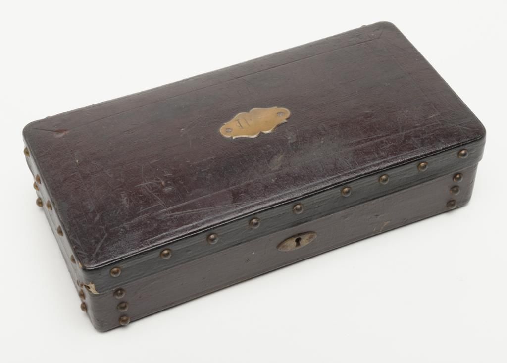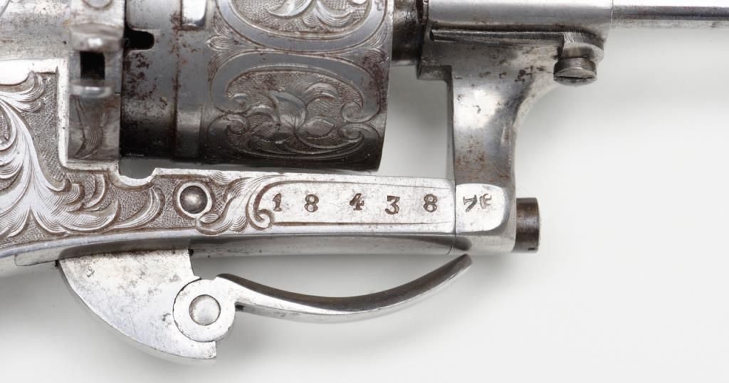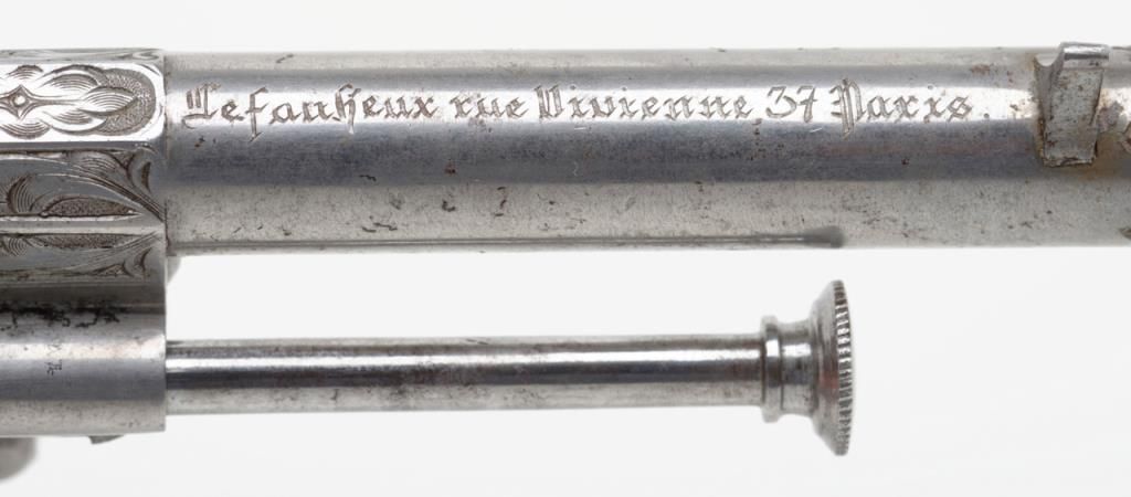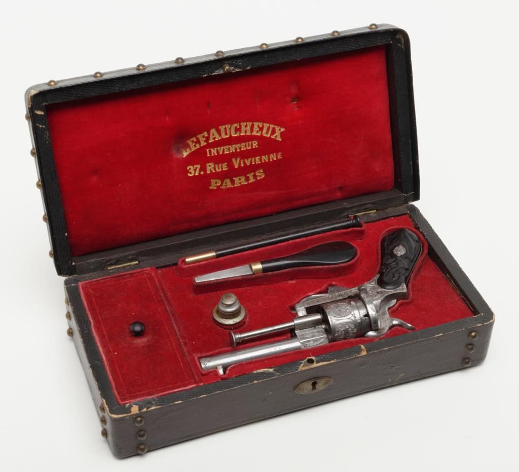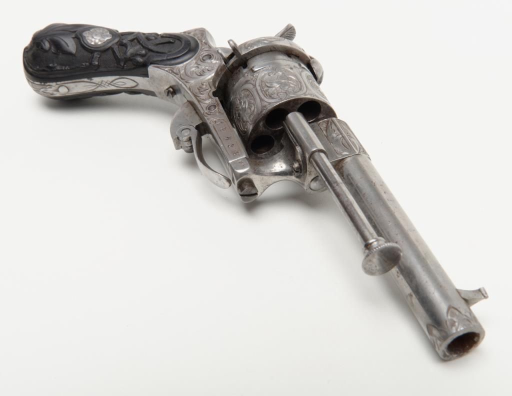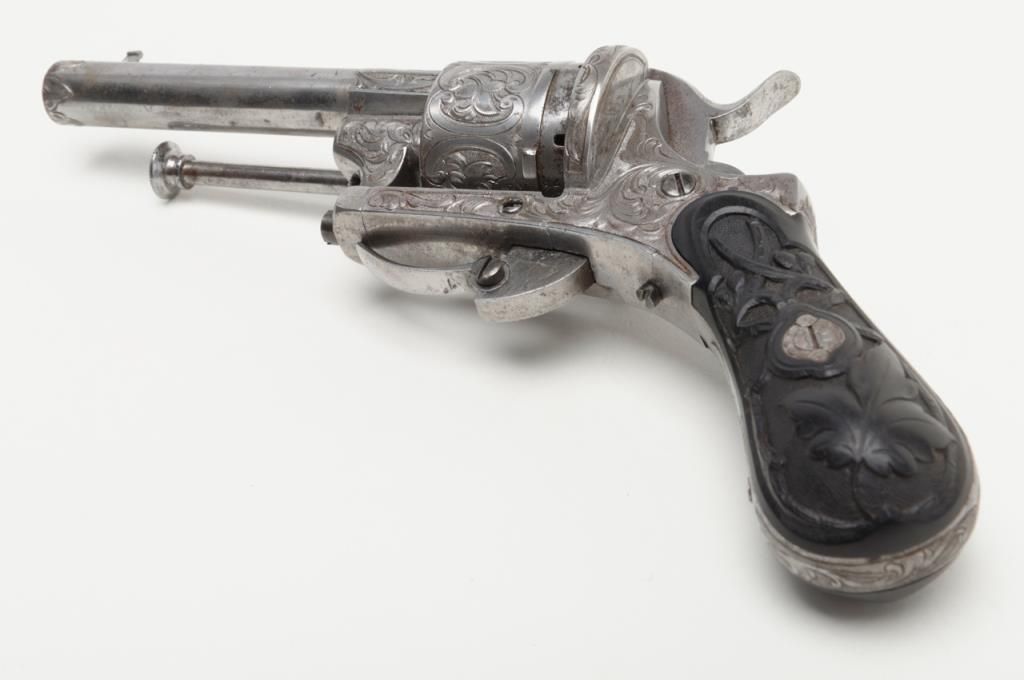 Deluxe engraved and cased double action pinfire revolver signed “Lefaucheux Inventeur, 37. Rue, Vivienne, Paris” on the barrel and case. The ornately engraved pinfire revolver measures 8” overall and shows fancy carved in high reliefebony grips. The metal surfaces are polished bright or coin finished and remain in fine original condition with just some slight discoloration and very minor natural aging. The barrel address is sharp and crisp. The actionworks well. The pistol is contained within a closely fitted French style case lined in red velveteen and showing gold book binder type embossed marking in lid. The case contains a screwdriver, utility rod and oiler. There is acompartment for cartridges in the corner of the box. The interior of the case is very good plus to near fine with just some minor impressions and slight normal aging. The exterior of the case is black dyed Moroccan leather with brass tacks andthe strap type handle is missing. The overall condition of the case is very good plus to near fine. A very attractive high quality pinfire with great grips and an exceptional case. Est.: $1800-$3600